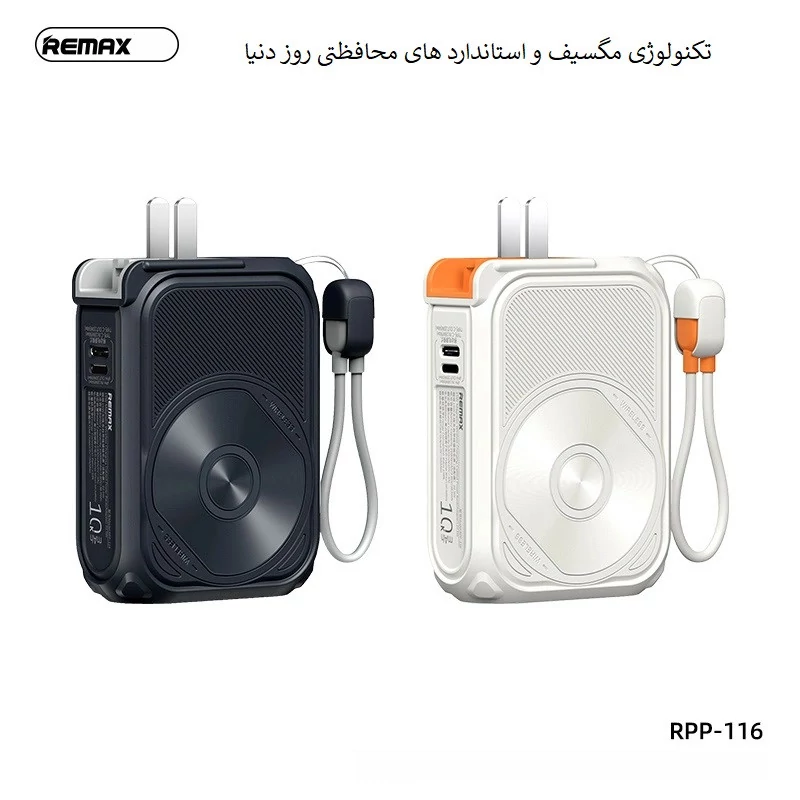 پاوربانک ریمکس Magnetic Wireless Fast Charge 22.5W یک پاوربانک بی سیم مگنتی با ظرفیت10000 میلی آمپرساعت با طراحی فانتزی، ظریف، باریک و سبک خود یکی از کوچکترین و با کیفیت ترین پاوربانک های موجود در بازار بحساب می آید. این محصول شارژر بیسیم و پاوربانک و یک دو شاخه برای شارژ دستگاه را در یک گجت در اختیار کاربر قرار میدهد تکنولوژی Power Delivery و Quick Charge 3.0 کوالکام و توان خروجی 22.5 وات امکان شارژ تلفنهای همراه با سرعت چند برابر نسبت به شارژرهای استاندارد را فراهم میکند. این پاوربانک قدرتمند امکان شارژ همزمان دستگاه را به کمک ماژول وایرلس و پورت خروجی برای شما فراهم کرده است. یک درگاه ورودی پورت Type-C و یک درگاه ورودی لایتنینگ جهت شارژ پرسرعت پاوربانک و یک خروجی وایرلس بیسیم از نوع Fast Wireless جهت شارژ تلفن همراه و انواع دستگاه هوشمند با فناوری Qi با بالاترین سرعت ممکن 15 وات است. این پاوربانک از تکنولوژی مگ سیف (MagSafe) که مختص گوشی های هوشمند که از این تکنولوژی پشتیبانی میکنند باعث میشود شما به راحتی پاوربانک را به پشت گوشی بچسبانید و از قابلیت شارژ وایرلس بهره مند شوید. تعبیه نمایشگر LED بر روی بدنه به منظور نمایش درصد شارژ محصول از دیگر قابلیت های این پاوربانک است تمرکز جدیدترین تکنولوژی ها در این پاوربانک از جمله فناوری مقاومت در برابر اتصال کوتاه، محافظت در برابر گرمای بیش از حد و ولتاژ بیش از حد، حفاظت در برابر جریان اضافه خیال شما را از بابت سلامت گوشی و دستگاه های گران قیمتتان آسوده می کند. این پاوربانک موفق به کسب استاندارد های سلامت و ایمنی محصولات شامل CE / FCC / ROHS شده است. اگر بدنبال یک پاوربانک کوچک و جمع و جور و بیسیم اما پرقدرت هستید این پاوربانک تمامی انتظارات شما را از این بابت برآورده خواهد کرد.