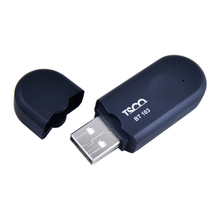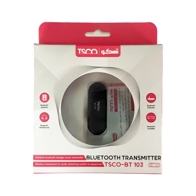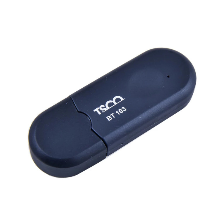 دانگل بلوتوث مدل BT 103 محصولی از برند تسکو است که قابلیت اتصال به هدست و اسپیکر بلوتوث را داراست و مناسب برای انتقال صدای TV به تمامی اسپیکرها و هدست های دارای بلوتوث می باشد .دانگل بلوتوث BT 103 نیازی به نصب نرم افزار و راه اندازی ندارد و به صورت پرتابل قابل استفاده است و برای روشن شدن دستگاه کافیست پورت USB را به منبع تغذیه (آداپتور -5v) متصل کنید ، سپس کابل AUX یا صدا را به دستگاه BT 103 و همچنین به خروجی دستگاه فرستنده مانند ( TV, .......) وصل کنید. سپس بلوتوث دستگاه ( مانند اسپیکر ، هدفون و .....) در حالت روشن نگه دارید تا به صورت خودکار به آن متصل گردد.