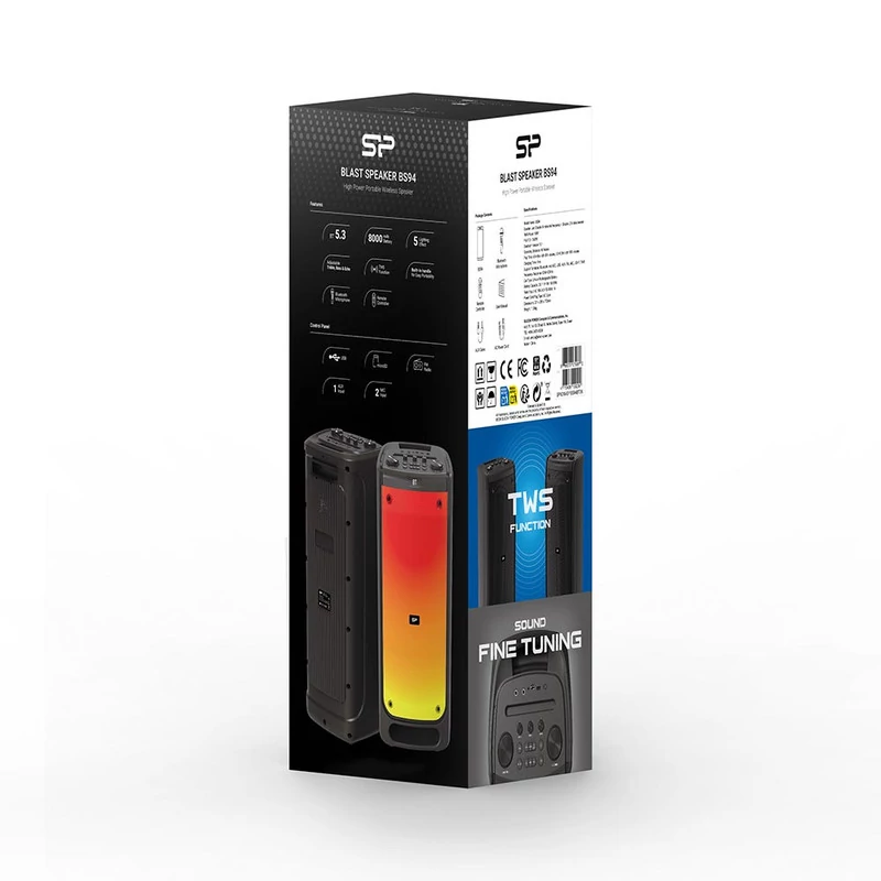 اسپیکر بلوتوث سیلیکون پاور مدل BS94 از جدیدترین محصولات پرقدرت و پرطرفدار کمپانی سیلیکون پاور است. این هیولای دوست داشتنی، با بیس قوی، تجربهای هیجان انگیز از لذت شنیدن موسیقی را به شما ارائه میدهد.از مهمترین ویژگیهای اسپیکر سیلیکون پاور مدل BS94 میتوان به سایز 2 درایور 8 اینچی به همراه 2 توییتر 2.5 اینچی اشاره کرد. همچنین دارای توان خروجی بالای 90 وات و توان لحظهای 1300 وات است. یکی دیگر از ویژگیهای مورد پسند این محصول، مربوط به نورپردازی آن است که دارای طیفهای رنگی متنوعی است. مورد دیگری که میتوان بعنوان ویژگی پرطرفدار به آن اشاره کرد، قابلیت پشتیانی از AUX، فلش مموری، کارت حافظه به همراه قابلیت اتصال به رادیو است. باتری این اسپیکر همچنین از نوع لیتیوم قابل شارژ با ظرفیت 11.1 ولت 8000 میلی آمپر ساعت است.علاوه بر موارد گفته شده در ارتباط با طراحی و کارایی این مدل، باید به مدت زمان استفاده از آن نیز اشاره نمود که حدود 4.5 ساعت تا 6 ساعت با میزان صدای 80% و حدود 5.5 تا 6.5 ساعت با میزان صدای 50% را پشتیبانی میکند. علاوه بر آن مدت زمان شارژ این کالا حدود 4 ساعت خواهد بود. همچنین اسپیکر BS94 با ابعاد 321*295*772 میلیمتر و وزن 11.26 کیلوگرم مناسب برگزاری مهمانی و دورهمی نیز خواهد بود. بازه فرکانس این محصول بین 50 هرتز الی 20 کیلوهرتز است. فناوری True Wireless Stereo یا به اختصار TWS یک راه ارتباطی بر پایه فناوری بلوتوث است که امکان برقراری اتصال بدون سیم دو دستگاه همنام را فراهم کرده است